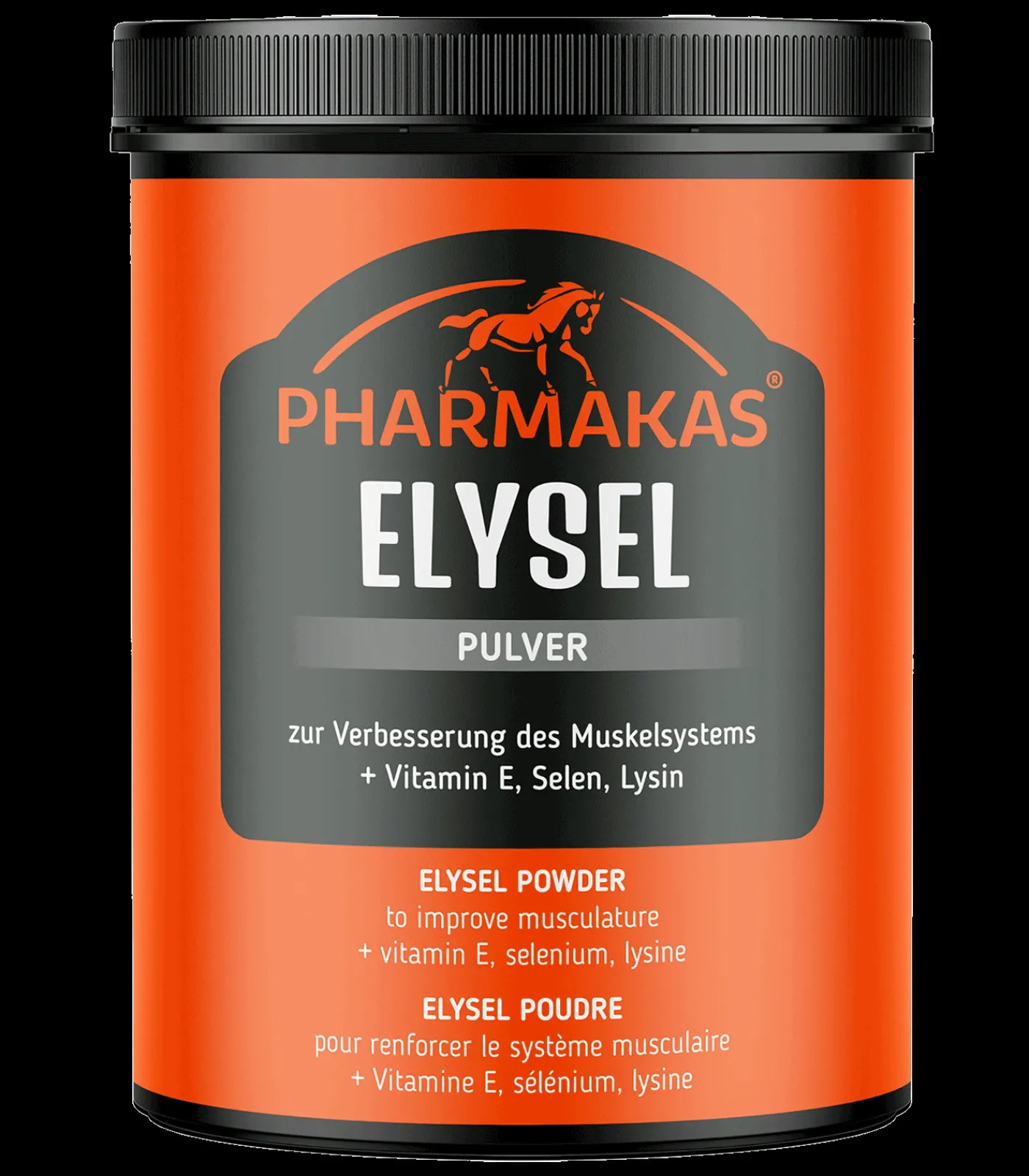 Pharmakas® Elysel Pulver enthält Vitamin E, Selen in organsischer Form, und Lysin zur Verbesserung des Muskelsystems und zur Steigerung der Kondition. Es sorgt für Losgelassenheit und einen entspannteren Bewegungsablauf.