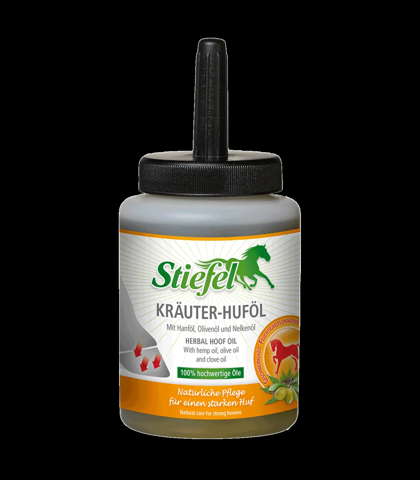 Tipp: Auf feuchten Hufen zieht das Kräuter-Huföl besonders gut ein.