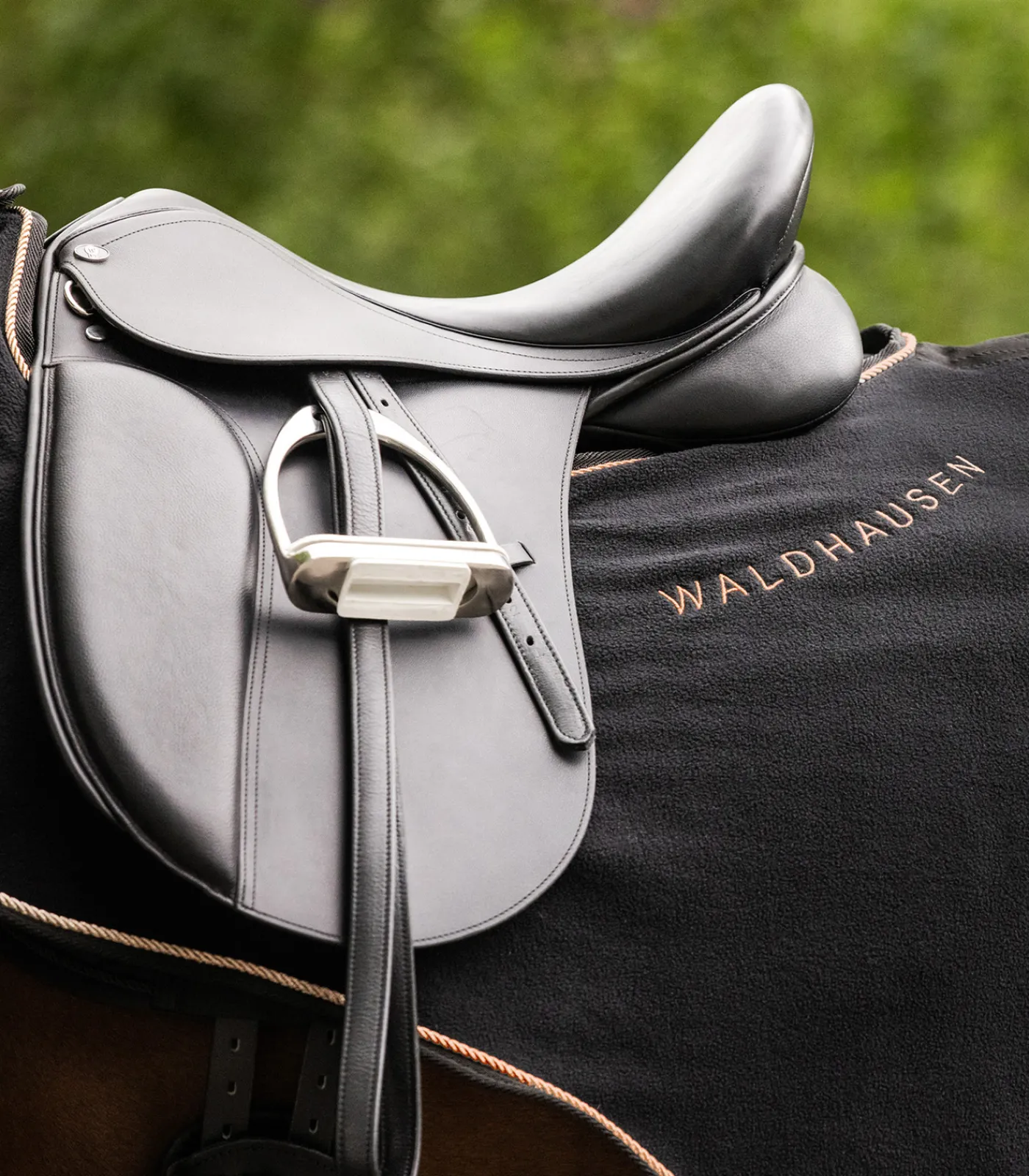 Elegante Nierendecke mit Sattelausschnitt aus hochwertigem Antipilling Fleece. Eine roségoldene Kordel, sowie Stickung entlang des Sattelausschnittes sorgen für einen eleganten Auftritt. Mit solidem Klettverschluss am Widerrist.