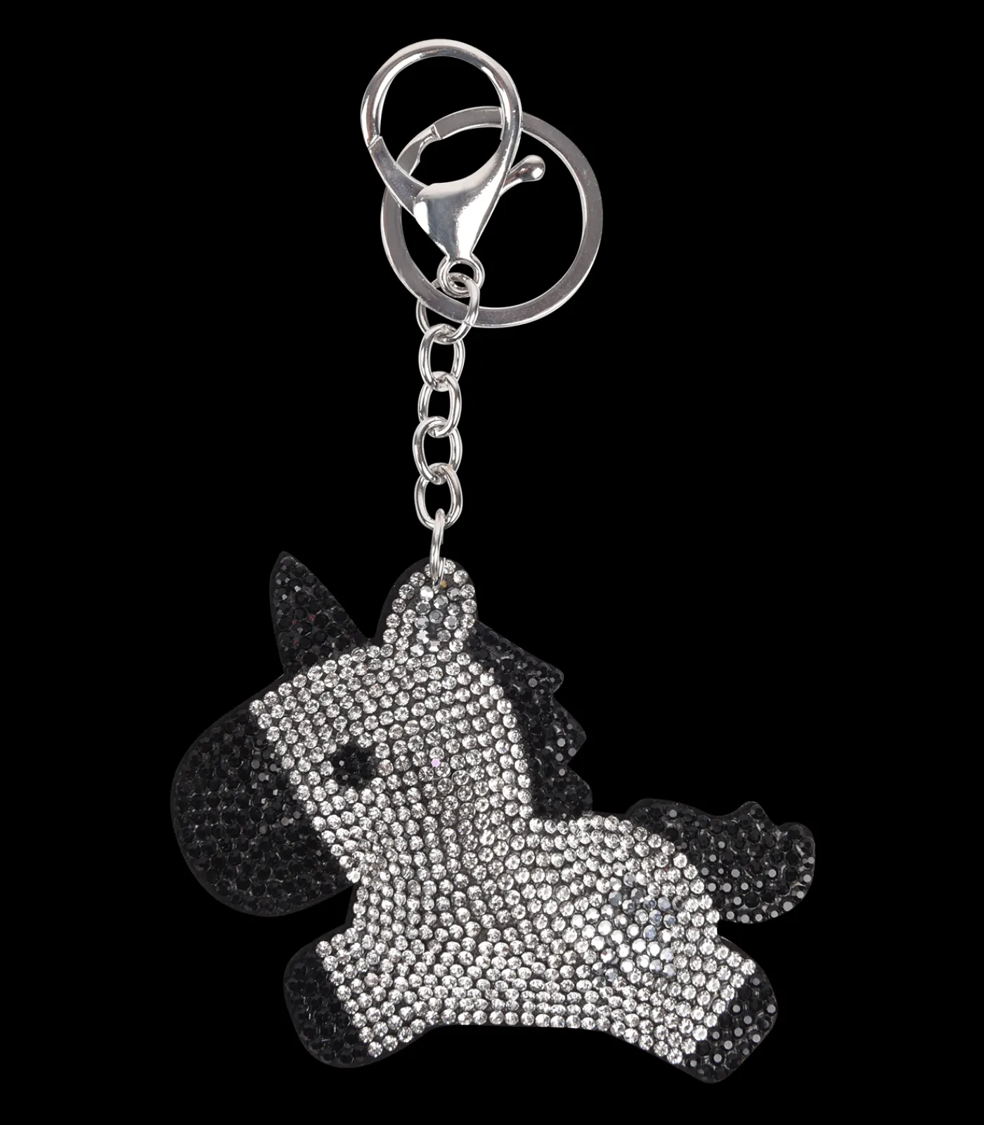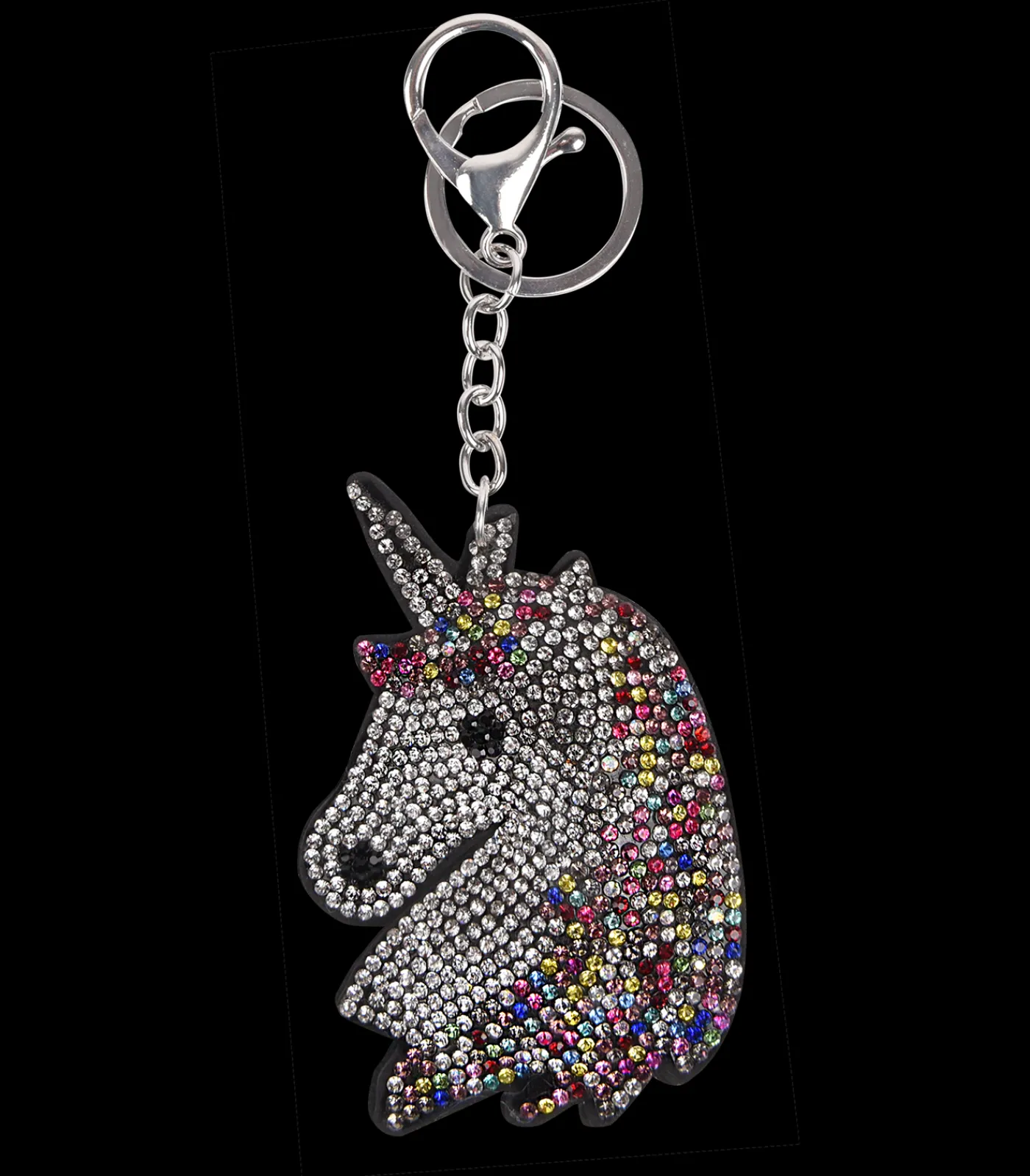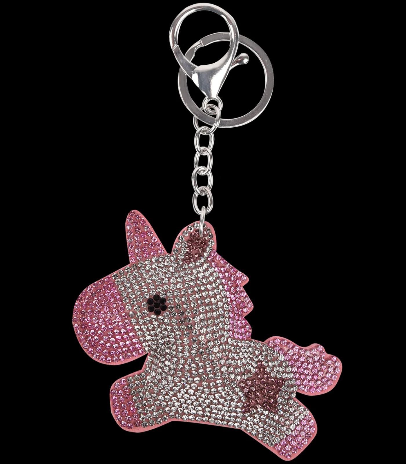 Vier stylische, glitzernde Taschenschmuck-Anhänger stehen zur Auswahl. Der Anhänger mit aufgesetzten Glitzersteinchen wird auch schnell zum Lieblingsstück am Schlüsselbund.