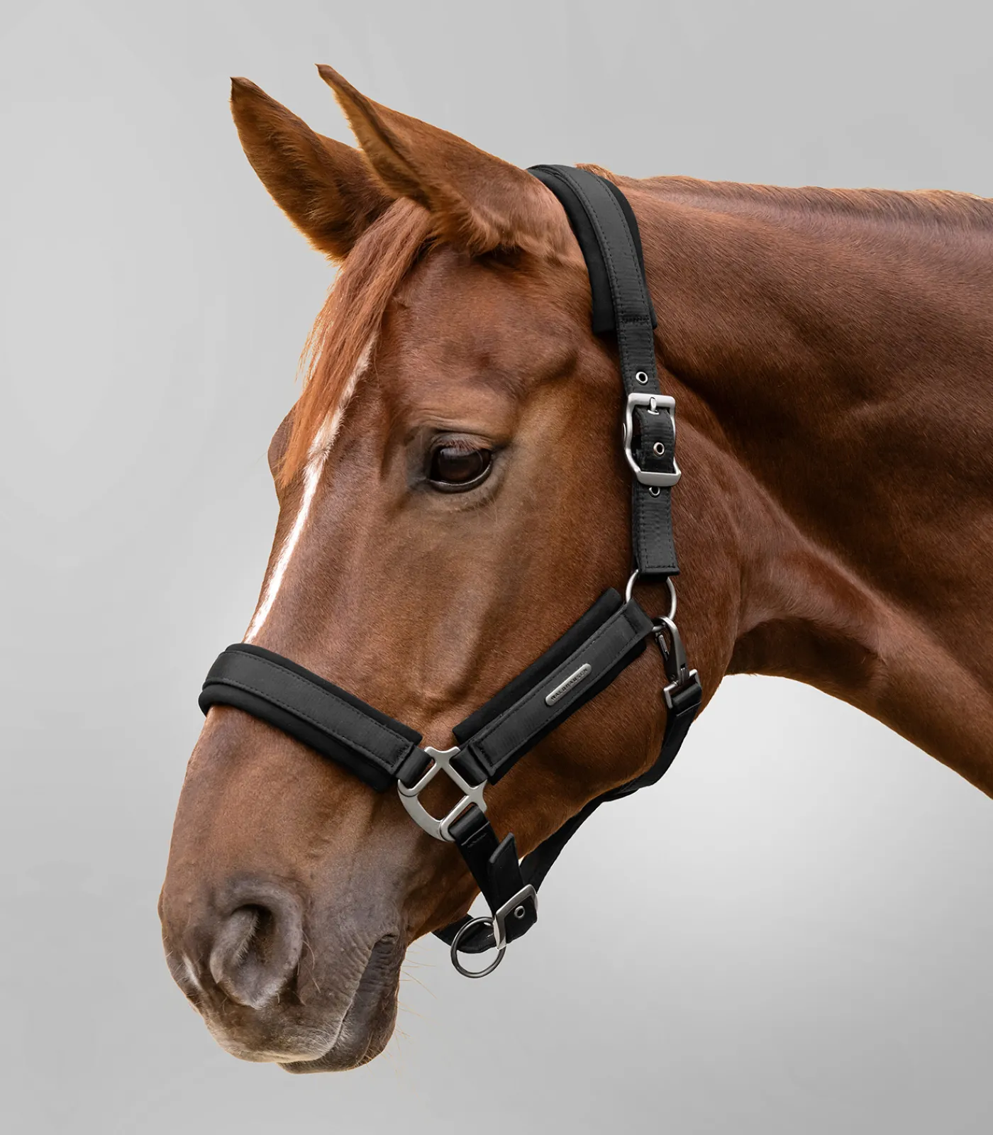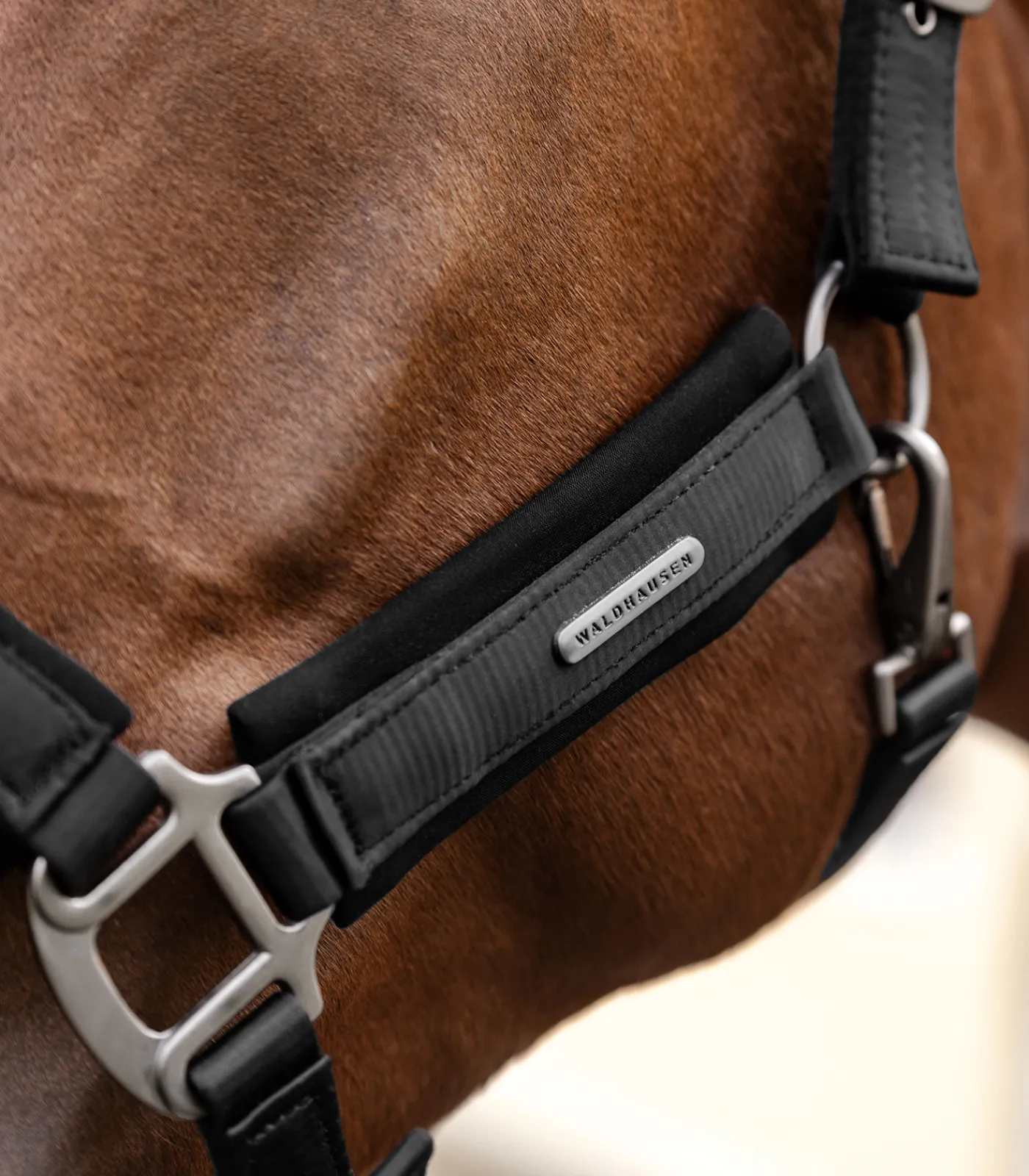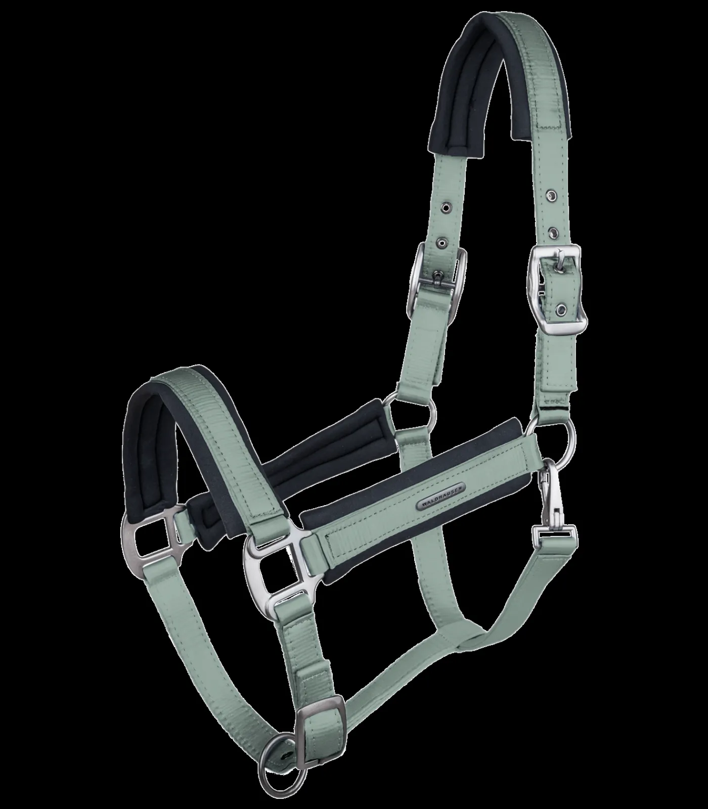 Hochwertiges Halfter mit einem edlen Satin-Überzug. Das Halfter ist mit Softmaterial an Genick-, Nasen- und Backstücken unterlegt und bietet dadurch einen hohen Tragekomfort. Am Kinnriemen einfach und am Genickstück beidseitig verstellbar. Mit dunklen Beschlägen, Schnappkarabiner und anthrazit Waldhausen Logo.