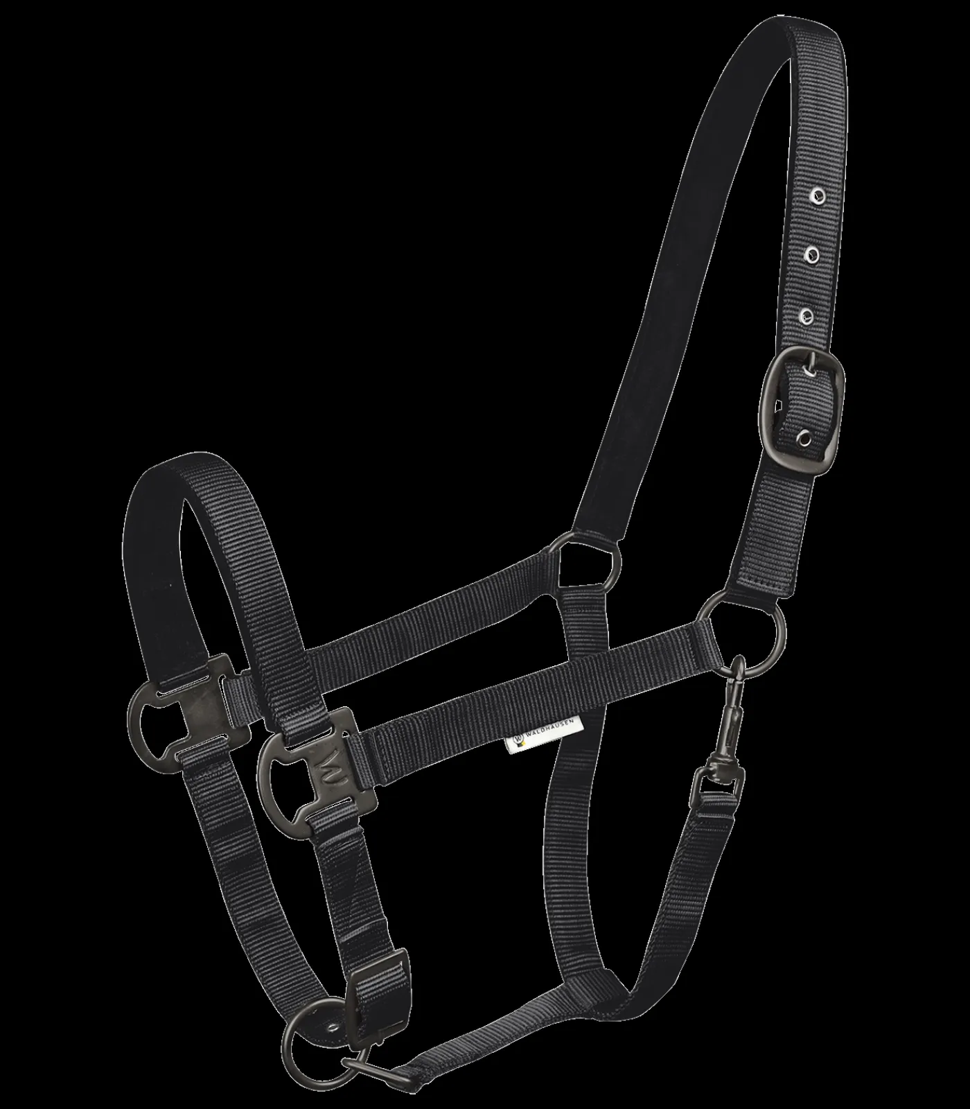 Weich unterlegtes Halfter, mehrfach verstellbar. Mit mattierten, dunklen Beschlägen. Am Kinnriemen und Genickstück (einseitig) mehrfach verstellbar. Passend zu Anbindestrick Gloomy 50486 und 50487.