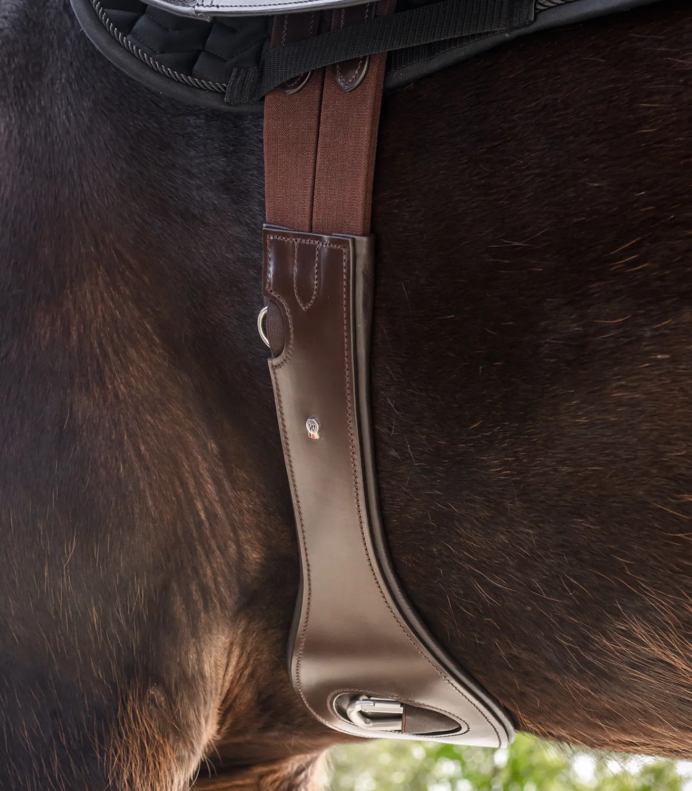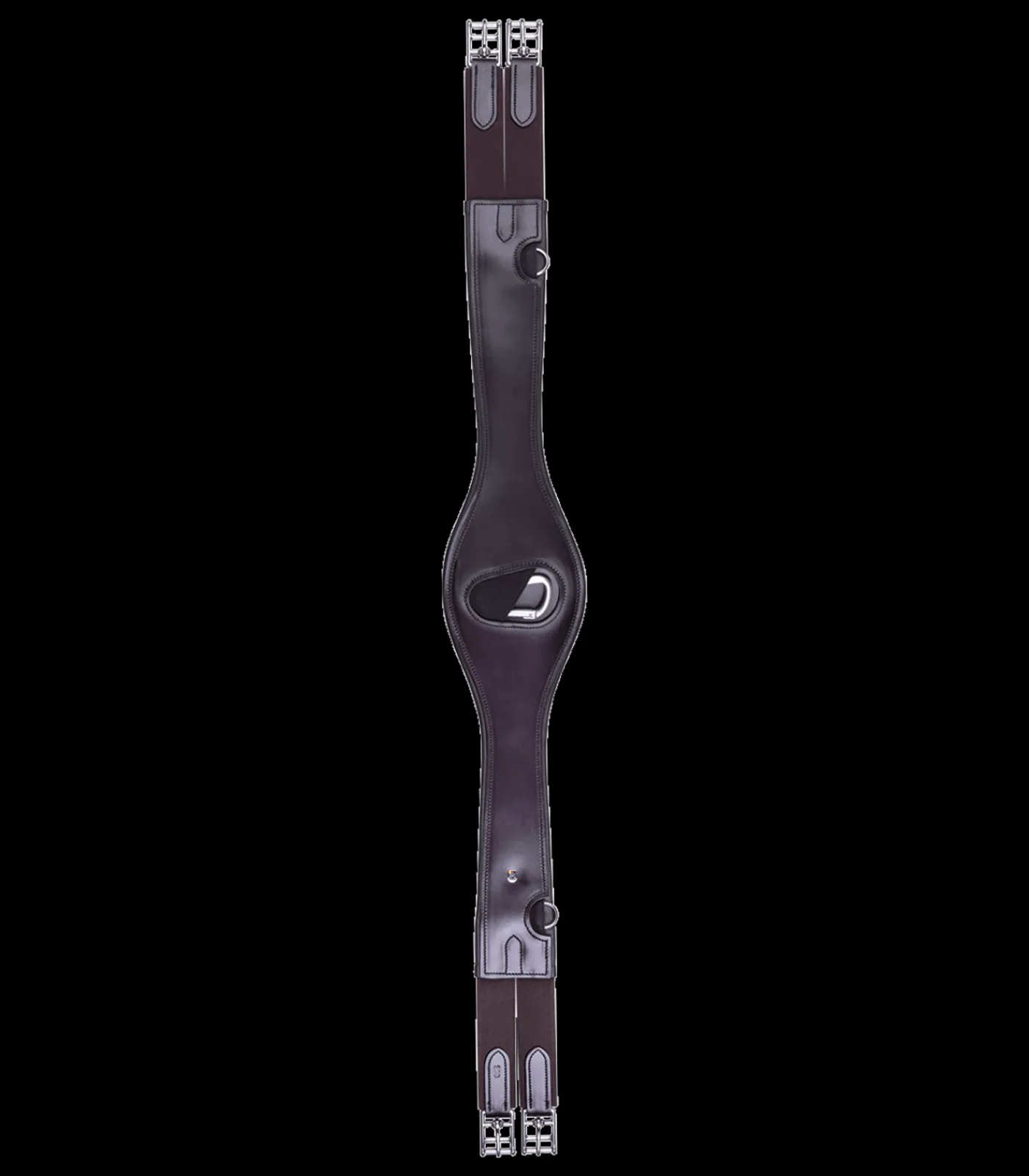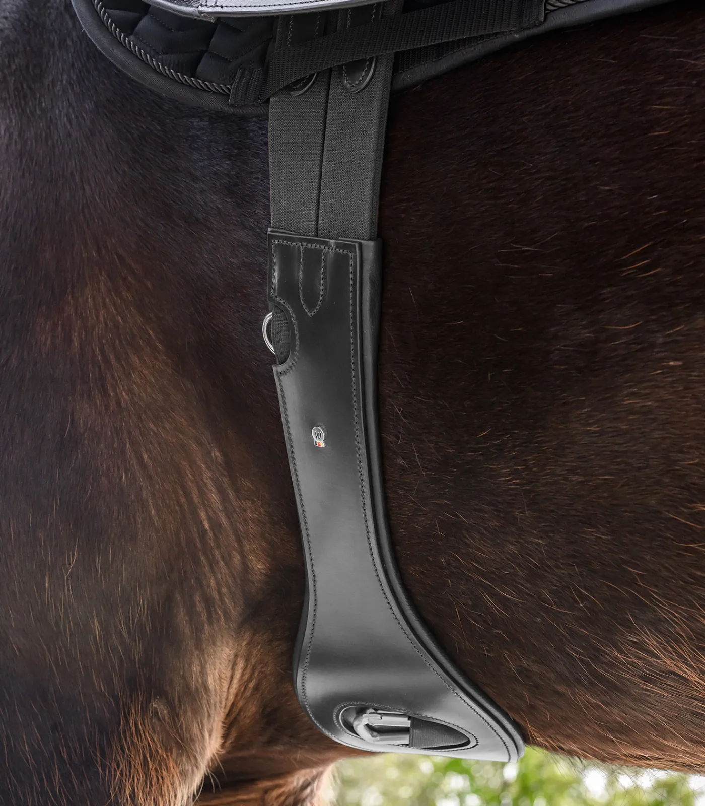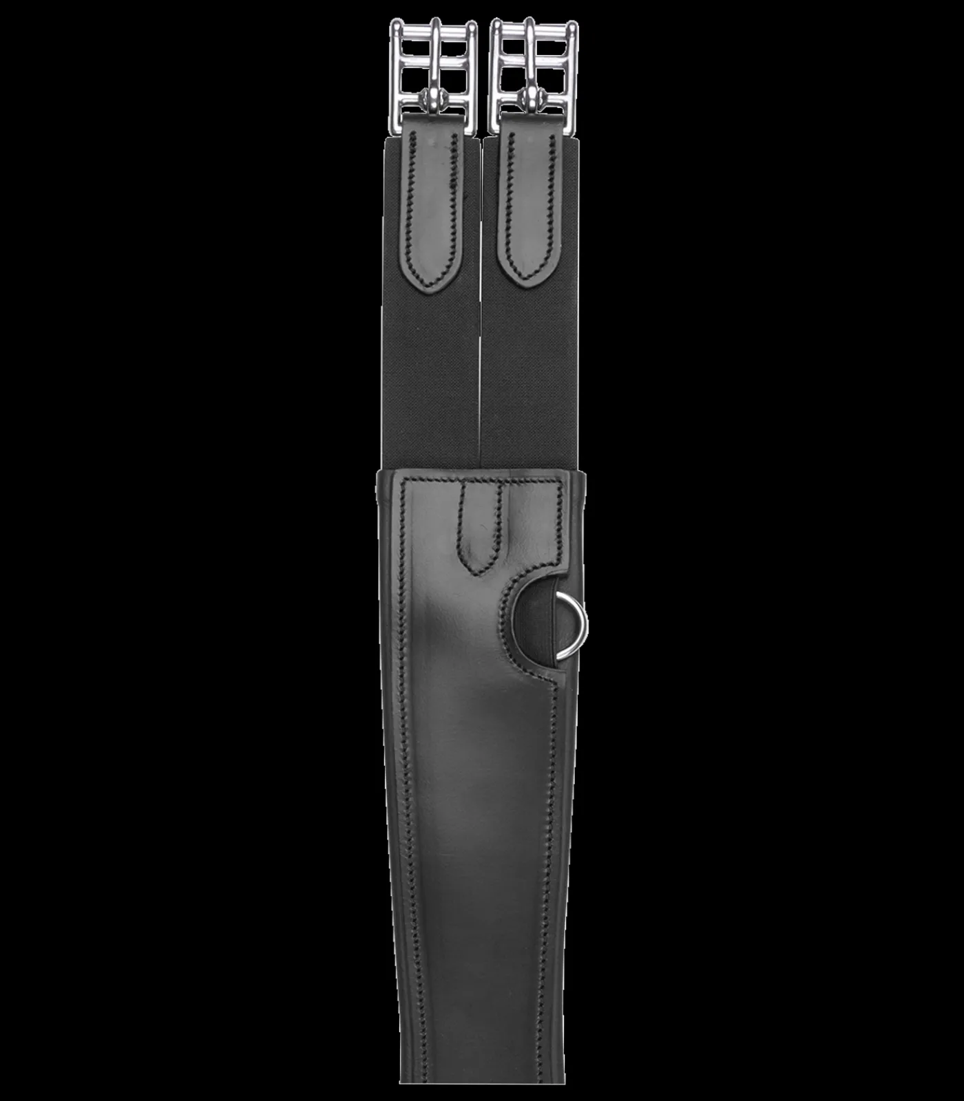 Weich unterlegter Gurt aus qualitativ hochwertigem Leder. Passt sich optimal anatomisch am Pferd an. Beidseitig elastische Gurtenden und Edelstahl- Rollschnallen, sowie Ringe für Hilfszügel.