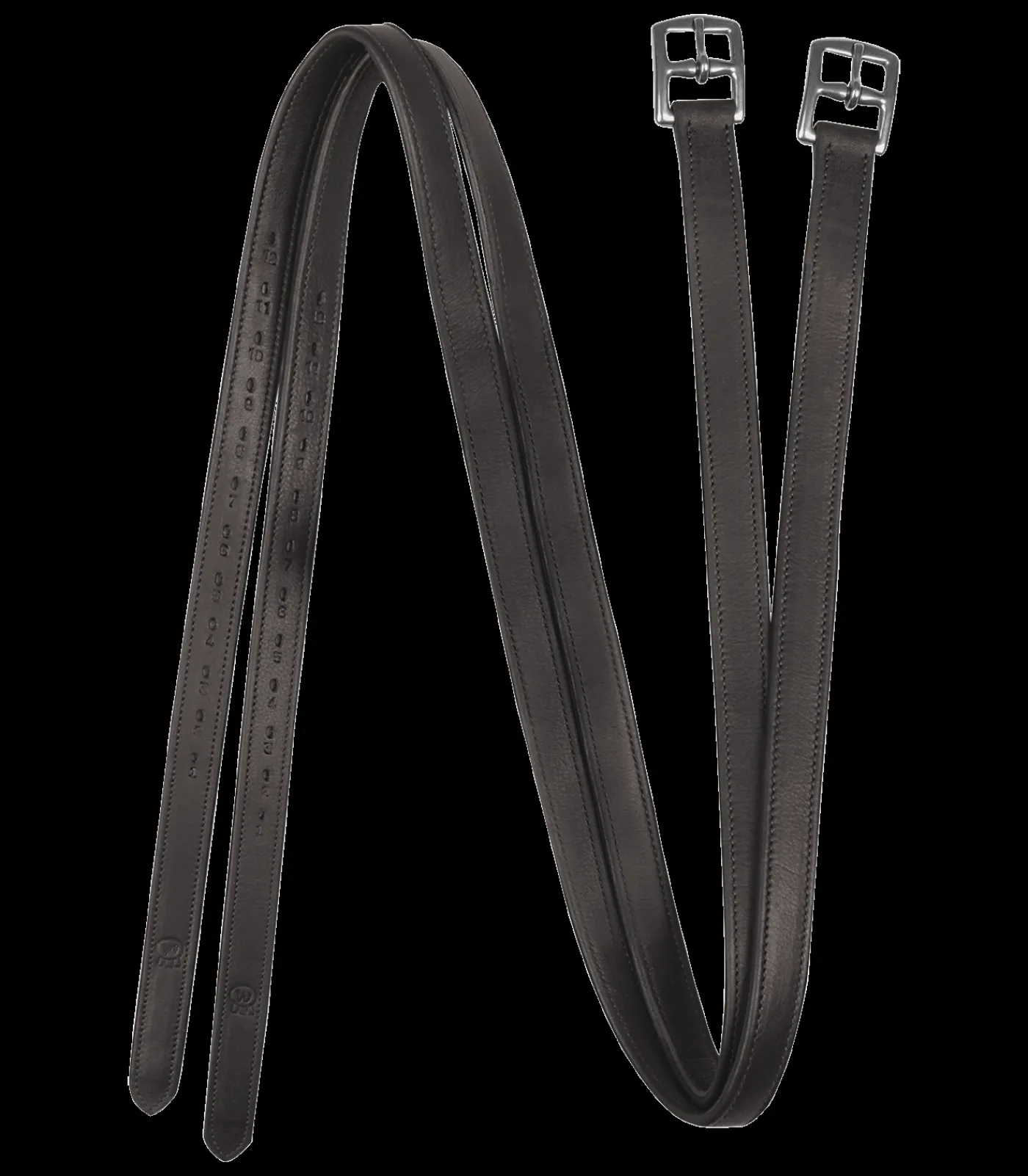 Steigbügelriemen aus weichem und geöltem Leder mit stabiler Edelstahlschnalle. Der Nylonkern verhindert Dehnung und Unebenheiten. Paar.