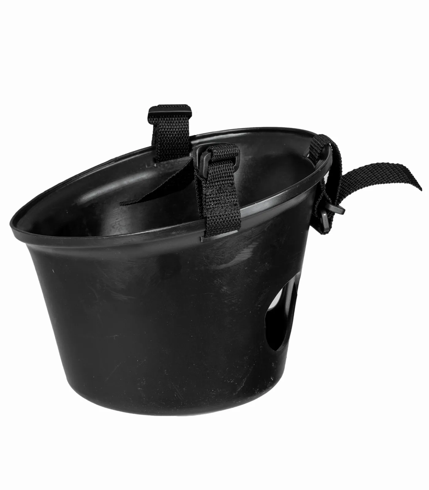 Stabiler, auswaschbarer Kunststoff-Maulkorb mit Nylonstrippen zum Einschnallen ins Halfter. Mit Luftlöchern für eine unbeschwerte Atmung.