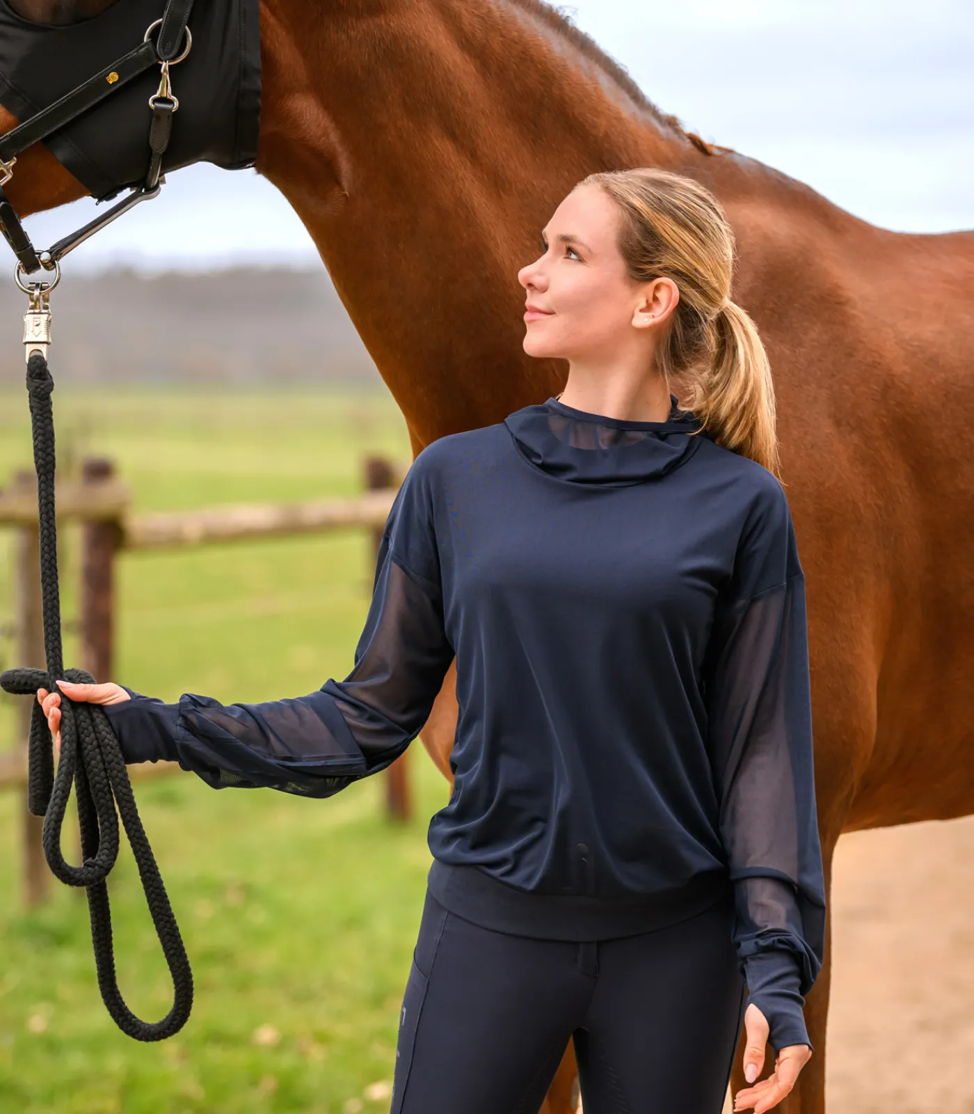 – Angeschnittene Kapuze mit elastischem Einfass und Öffnung für Zopf