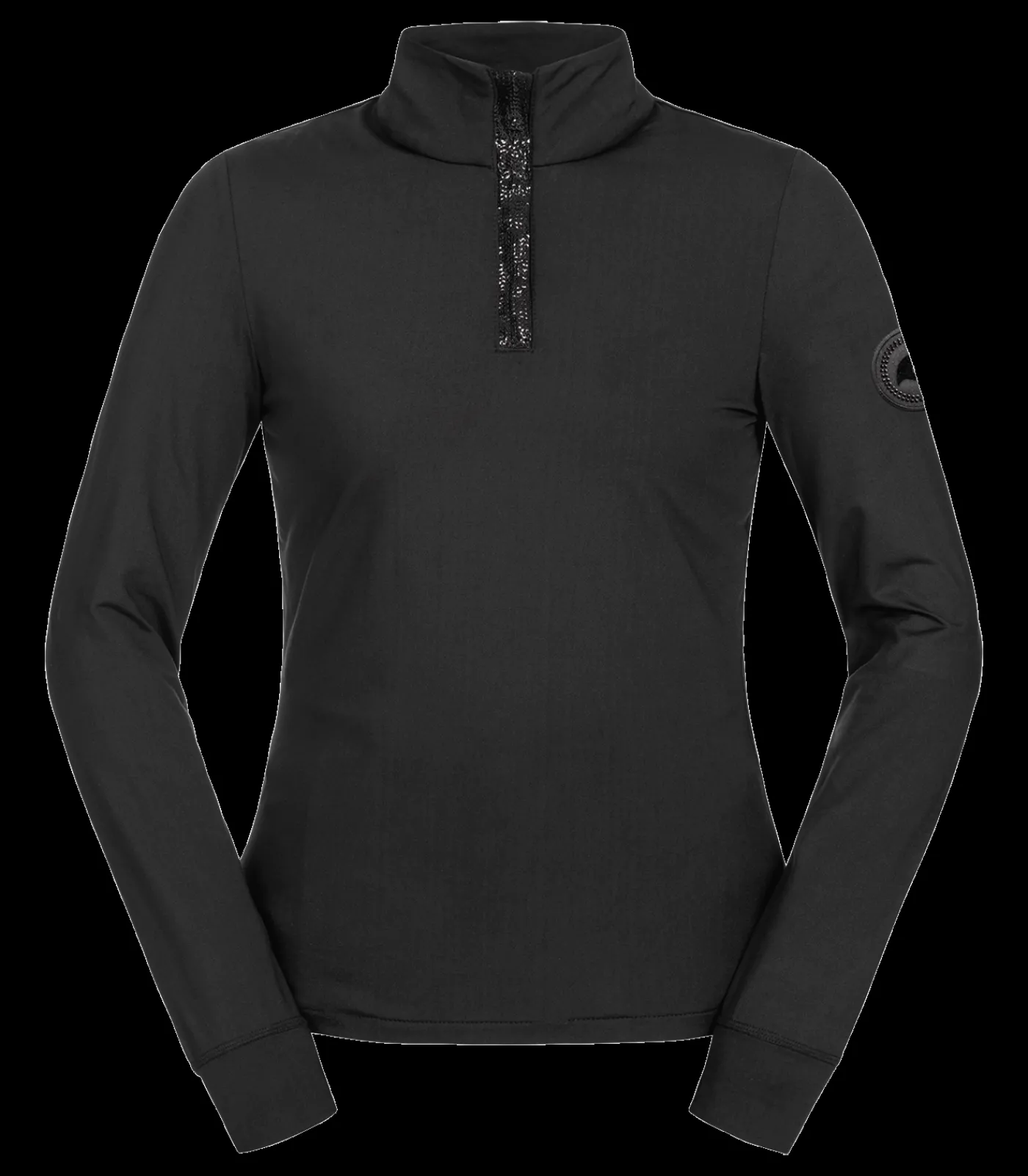 – Elegantes Badge mit schwarzen Glitzersteinchen und Flockprint-Logo
