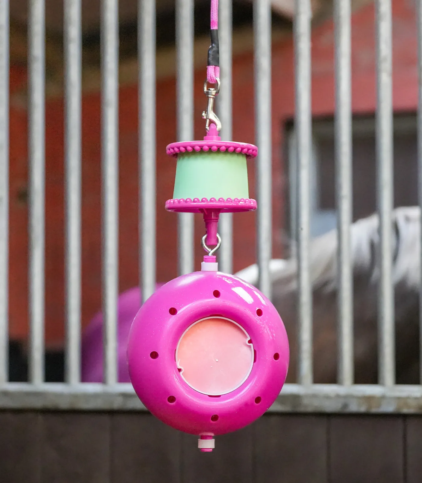 Pfiffige Kombination aus Lecksteinhalter und Spielball, die einfach in der Box oder auf dem Paddock aufgehängt werden kann. Zur sinnvollen Beschäftigung des Pferdes – zur Verminderung von Langeweile und Stress. Geeignet für zwei Likits à 250 g und einen Likit à 625 g. Lieferung erfolgt ohne Lecksteine!