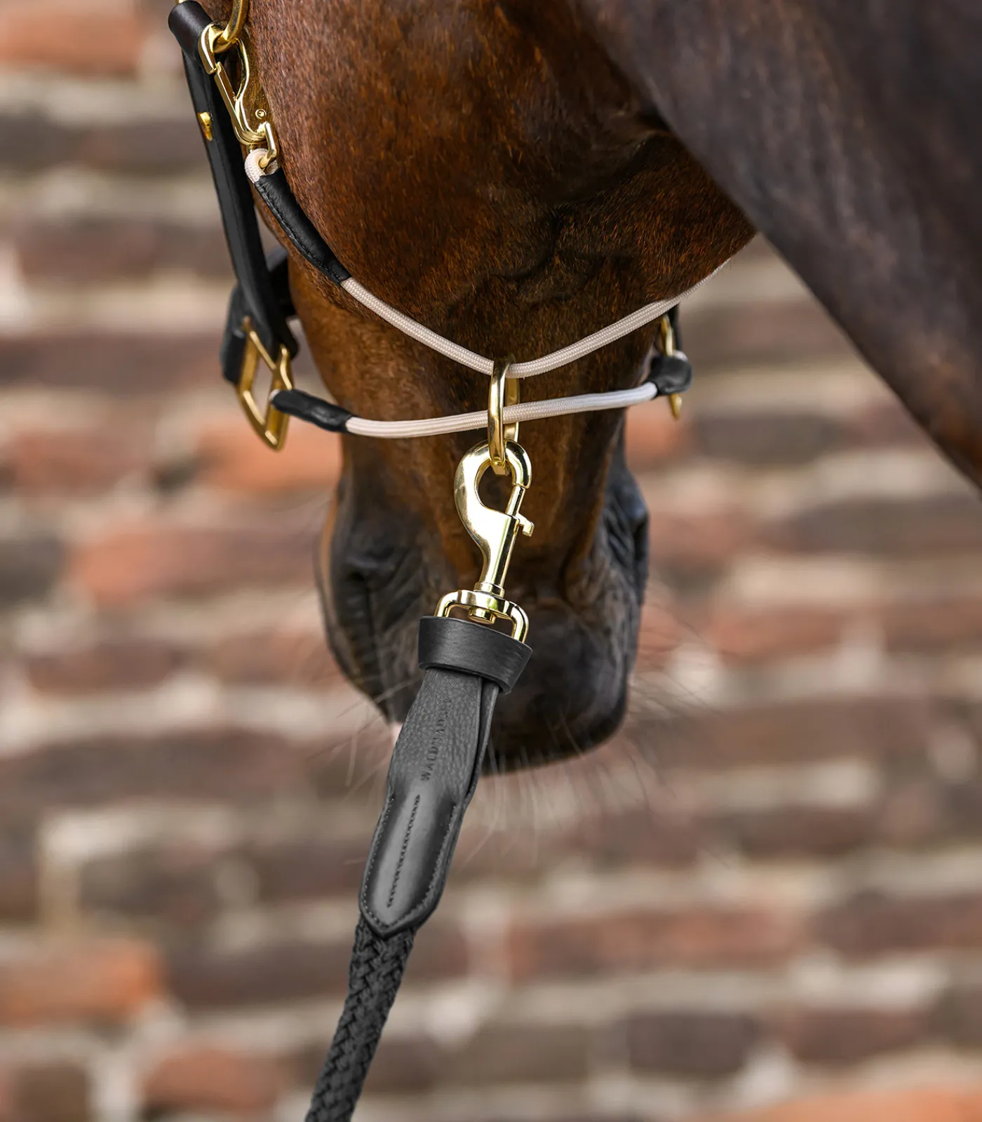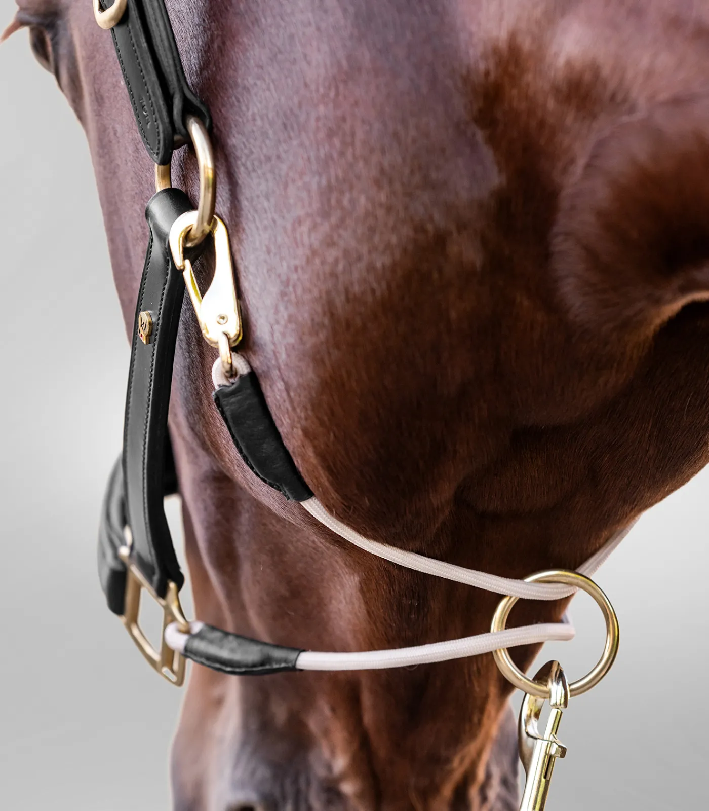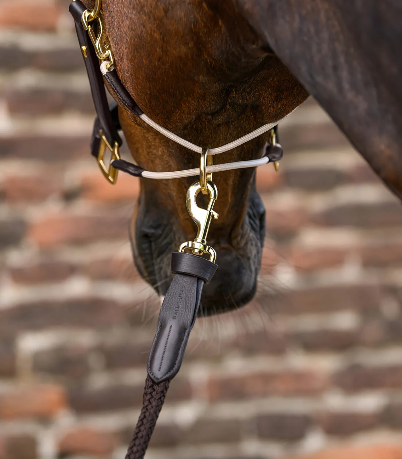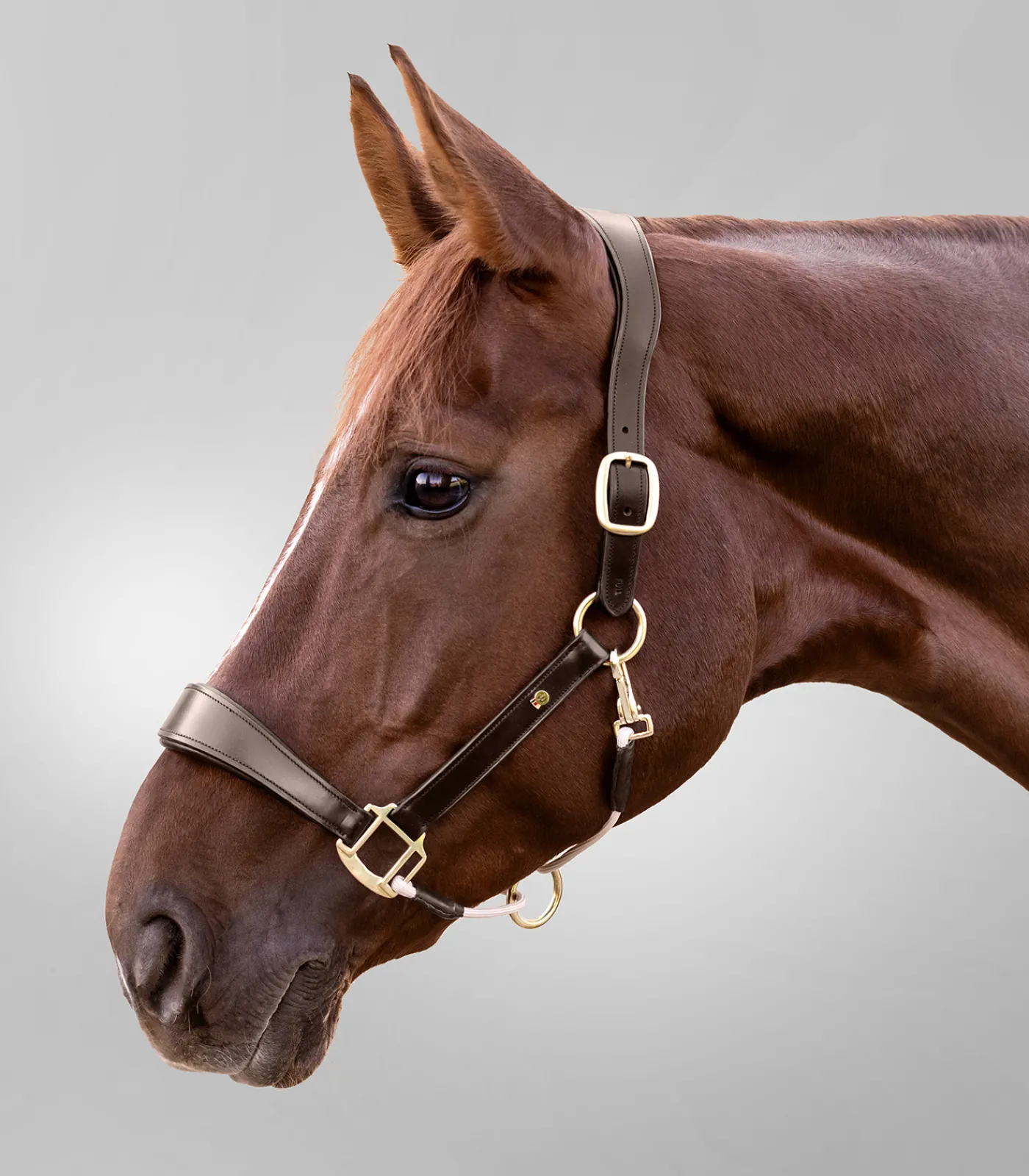 Hochwertiges Lederhalfter mit anatomisch geformtem Genickstück, beidseitig verstellbar. Nasenriemen und Genickstück sind weich gepolstert. Kehl- und Kinnriemen sind aus edlem Seil. Beide Teile sind durch einen mitlaufenden Ring verbunden, dank diesem liegt es ruhig an und verrutscht nicht. Außerdem wird die Gefahr vom „in den Strick treten“ umgangen.