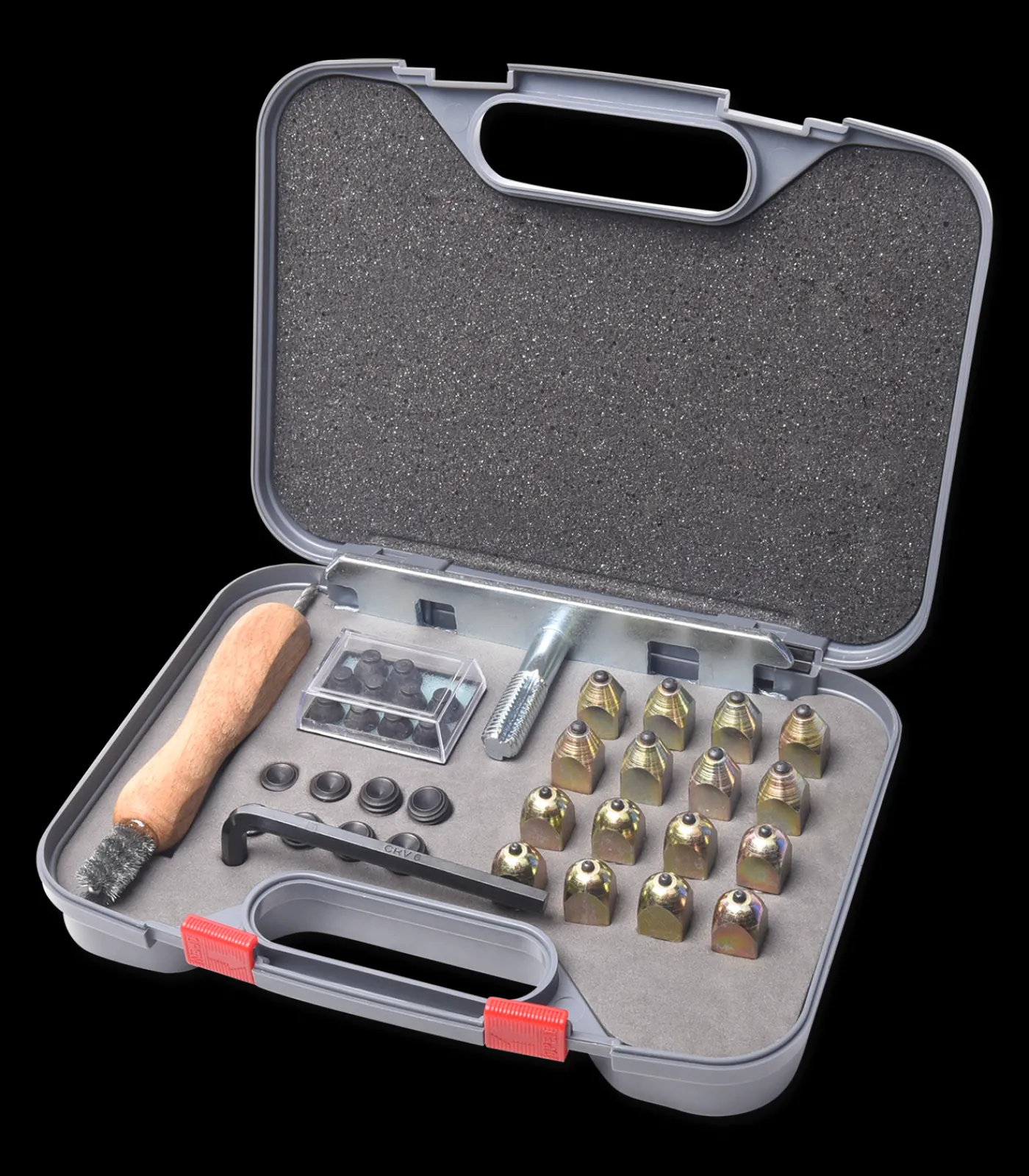 Praktischer Stollenkoffer, innen gepolstert. Enthält 8 Stollen, stumpf, Gewinde M 10/1,75 cm lang; 8 Stollen, spitz, Gewinde M 10/2,00 cm lang, 8 Gewindeschoner zum Eindrehen in die Stollenlöcher. Inklusive Stollenbürste, Gewindeschneider und Inbusschlüssel.