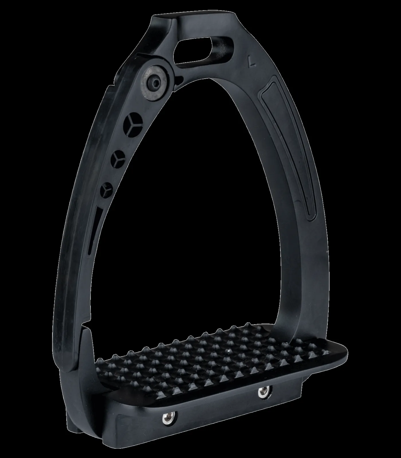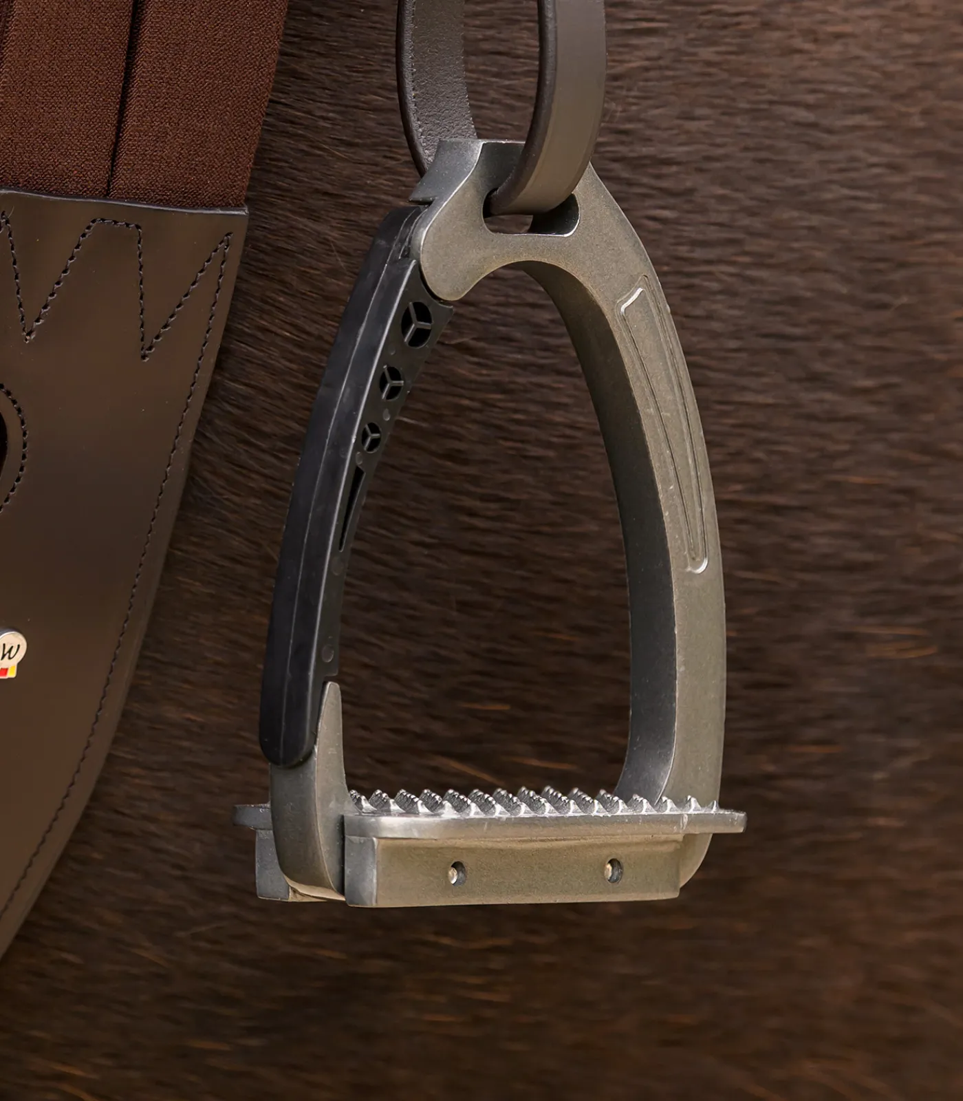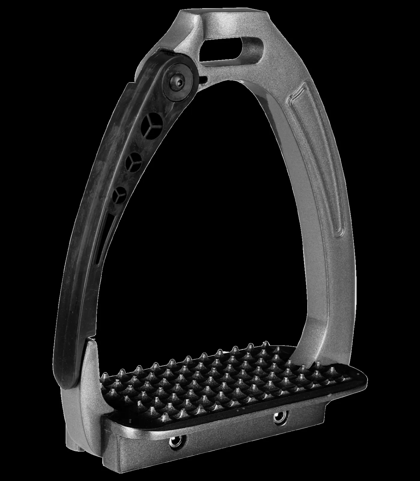 Steigbügel aus hochwertigem Aluminium mit einer 6,5 cm breiten und 12 cm langen Trittfläche. Mit einem Scharnier an der Außenseite. Durch das Reitergewicht öffnet sich das Scharnier im Falle eines Sturzes und verhindert ein Hängenbleiben im Steigbügel. Paar.