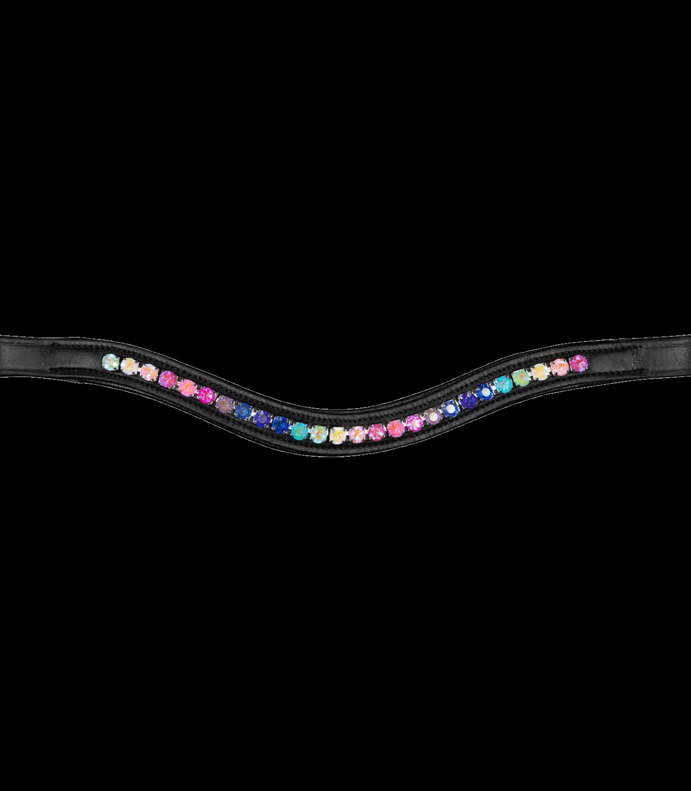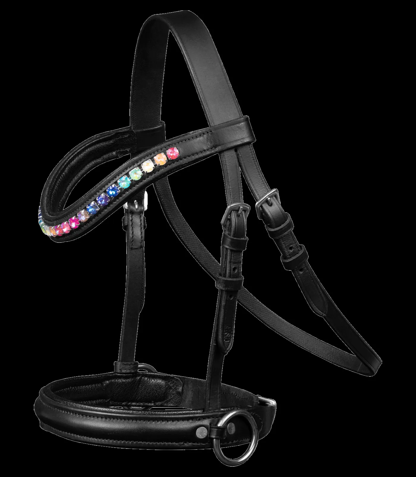 Dekozaum für Holzpferd aus Leder mit geschwungendem Stirnband mit bunten Glitzersteinen. Lieferung inklusive Zügel.