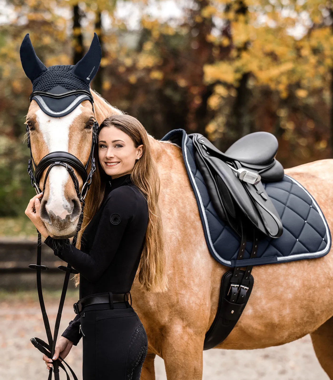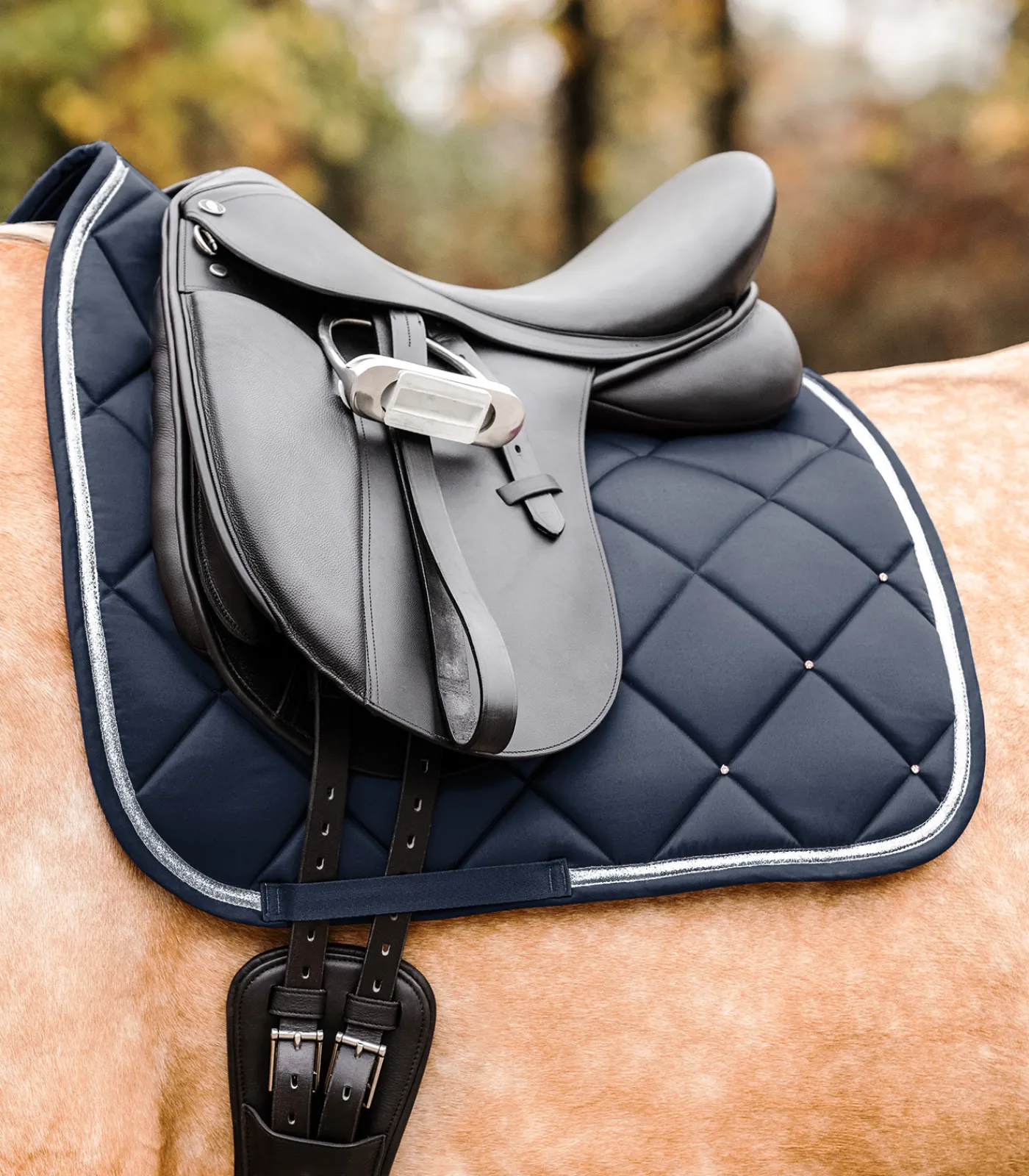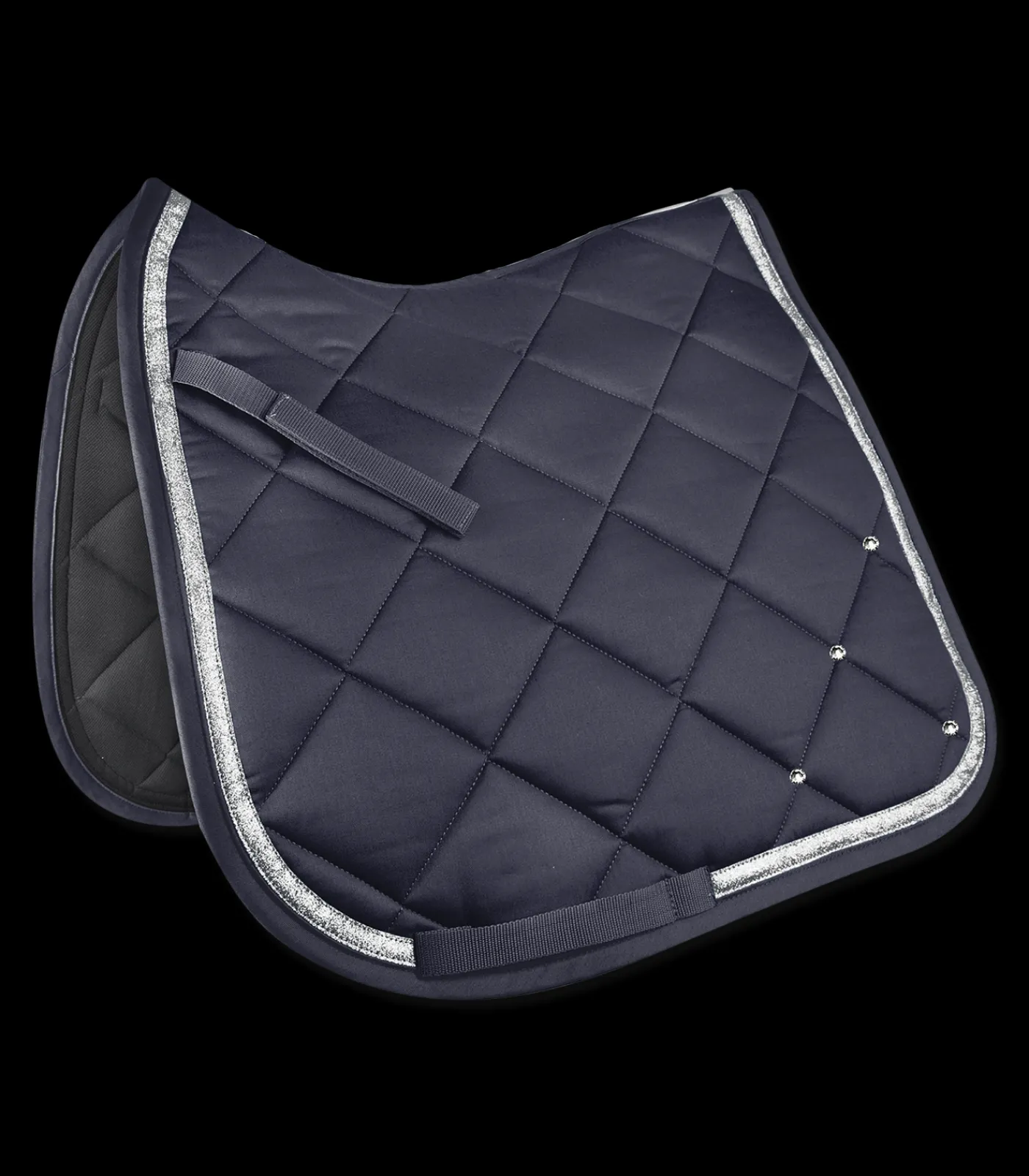 Elegante, hochwertige Schabracke mit Glitzerband. Die zusätzlichen Glitzersteine machen diese Schabracke zu einem echten Hingucker. Die funktionelle Unterseite sorgt für eine optimale Atmungsaktivität. 8 mm Schaum und 250 g/m² Watte gewährleisten beste Druckverteilung.